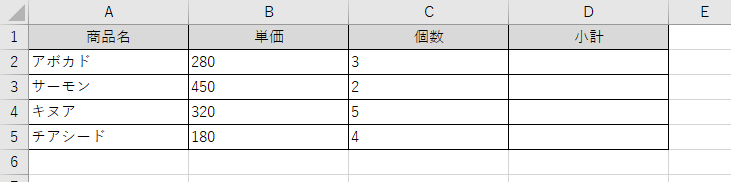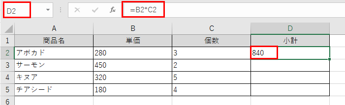 まず、小計を計算したいセル(D2)に以下の数式を入力します。