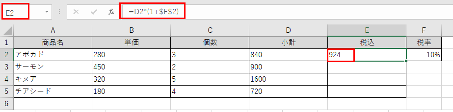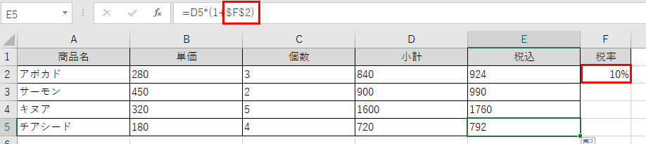 数式を下方向にコピーしても、D2はD3、D4と変化していきますが、$F$2は常にF2セルを参照し続けます。