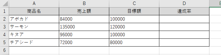 数式を下方向にオートフィルでコピーすれば、各商品の達成率が自動的に計算されます。
