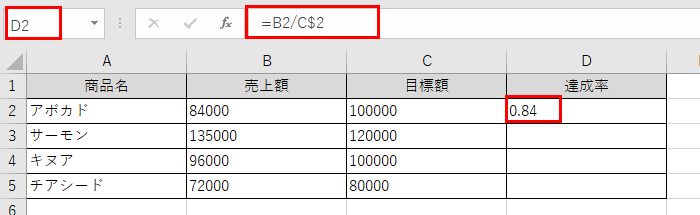 達成率を計算する際、割り算の分母(目標額)だけを固定したい場合を考えてみましょう。