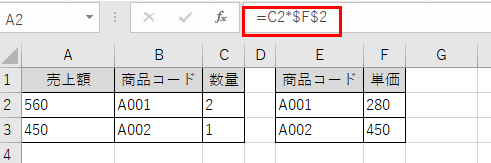 逆に、列だけを固定したい場合は$A2のように記述します。