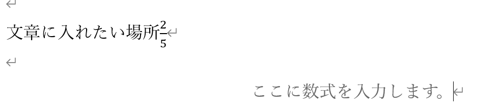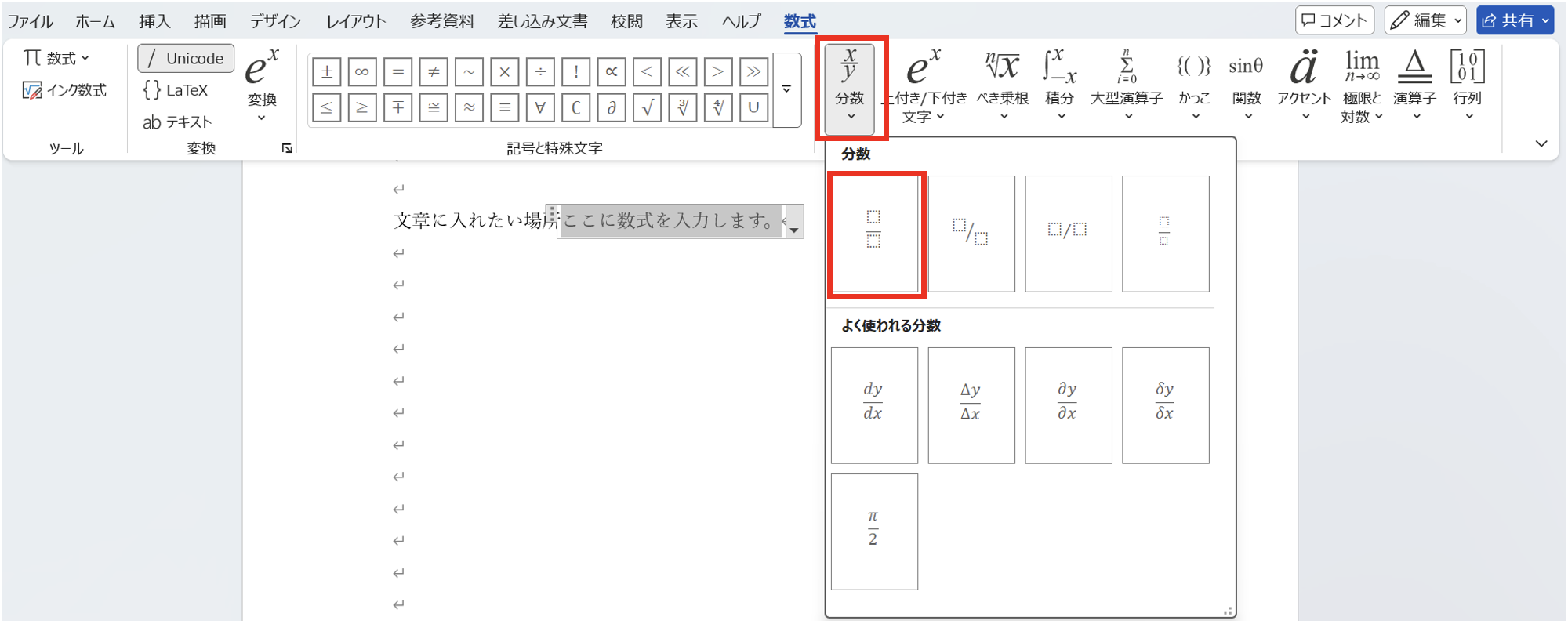 分数のテンプレートが挿入され、分子と分母の入力欄(プレースホルダー)が表示されます。