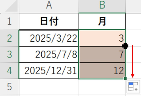 数式を下方向にオートフィルでコピーすれば、各日付から月だけが自動的に抽出されるわけです。