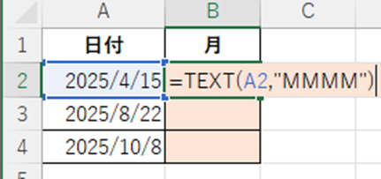 この数式は、A2セルの日付から月の部分だけを数値として取り出します。