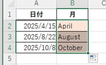 数式を下方向にオートフィルでコピーすれば、各日付に応じた月の表示が自動的に生成されます。