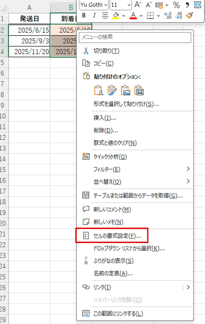 選択したセルを右クリックし、「セルの書式設定」を選択します。