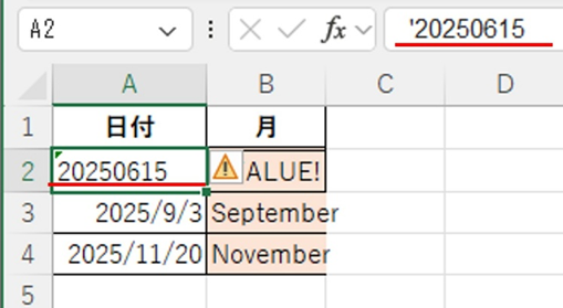 文字列として保存された日付には、MONTH関数やTEXT関数が機能しません。
