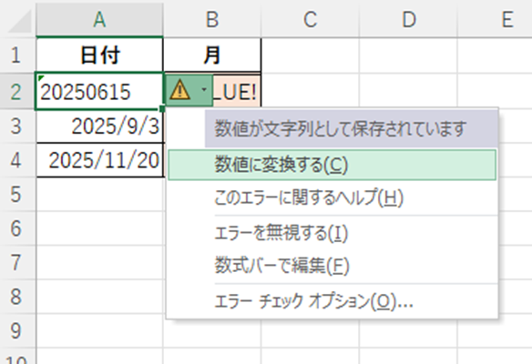 【操作のポイント:月が抽出できない主な原因は日付が文字列として保存されていること。DATEVALUE関数やエラーチェックオプションで日付形式に変換する】