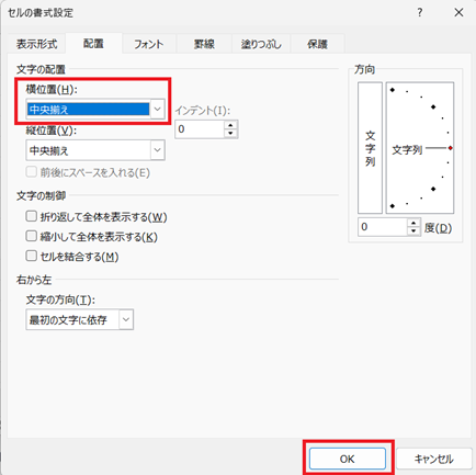 「配置」タブで「横位置:中央揃え」を選択し、「OK」で確定します。
