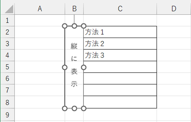 ・方法2:テキストボックスを使う(自由度が高い)配置したい位置にテキストボックスを描画→縦に表示したい文字を入力