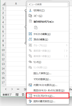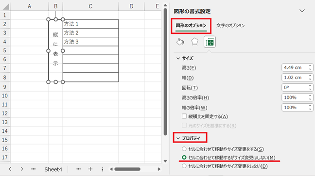 「図形のオプション」の「プロパティ」で「セルに合わせて移動するがサイズは変更しない」 を選択しておきましょう。