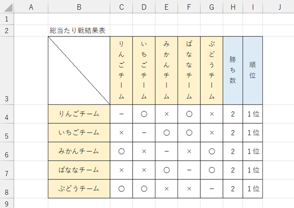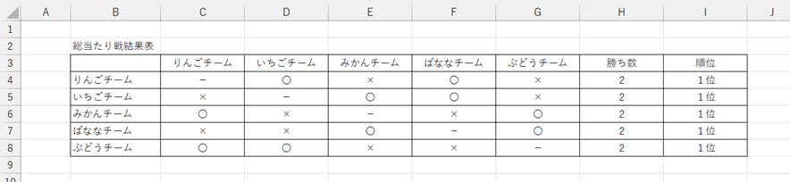 サンプルとして下のように横長になりやすい総当たり戦の表でチーム名を縦書きにしてみましょう。