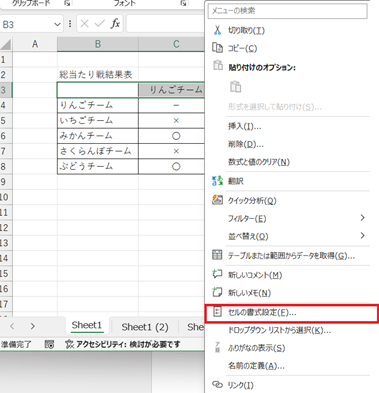 その範囲を選択し、右クリック → セルの書式設定 を選びます。