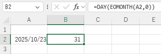 EOMONTH関数は指定した月の最終日を返す関数で、DAY関数はその日付から日だけを抽出する関数です。