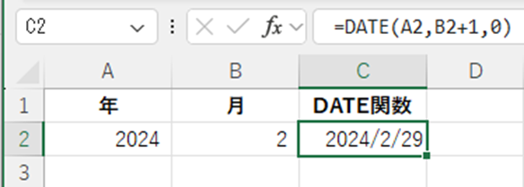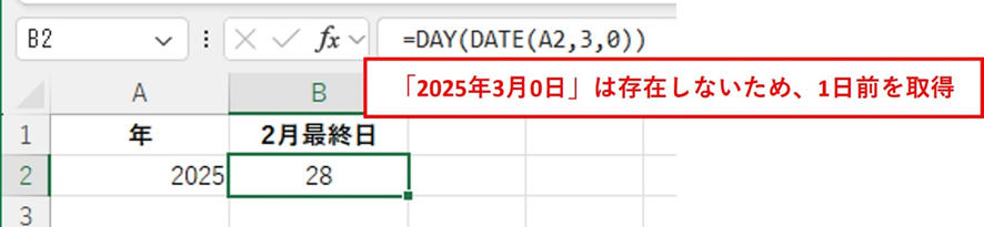 DATE関数は年・月・日を指定して日付を作成する関数で、日に「0」を指定すると前月の最終日を返すという特性を利用します。