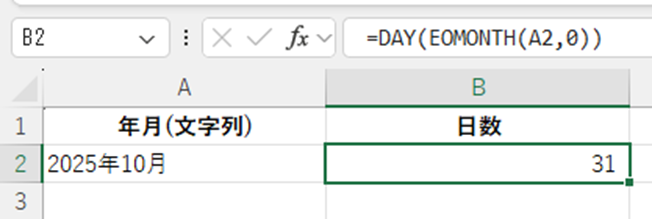 この数式を使えば、文字列として入力された日付からでも、正しく月の日数を求められます。