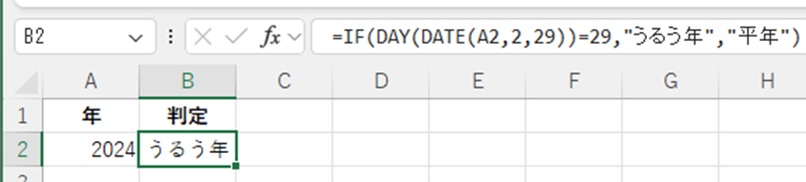 この数式は、指定した年の2月29日が存在するかどうかで判定しています。