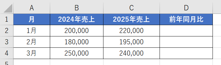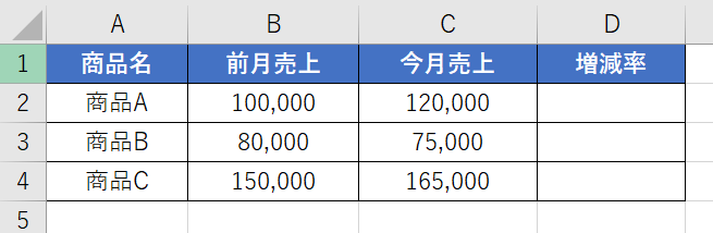 以下のようなサンプルデータを使って、実際に増減率を計算してみましょう。