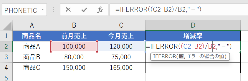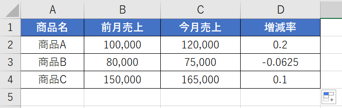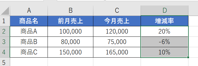 この数式をD3、D4セルにもコピーすれば、各商品の増減率が計算できます。