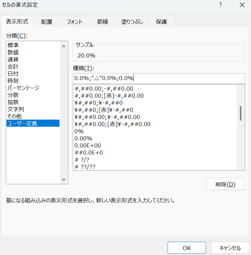 ・△表示:セルの書式設定のユーザー定義で「0.0%;”△”0.0%;0.0%」を入力