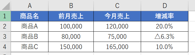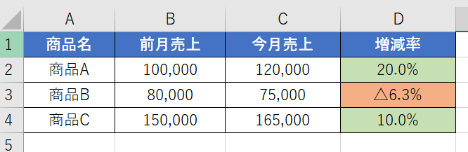 増減率が一目で分かるように、増加はプラス(青や緑)、減少はマイナス(赤)といった色分けをすると、データの傾向を素早く把握できます。