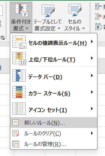 「ホーム」タブの「条件付き書式」をクリックし、「新しいルール」を選択しましょう。