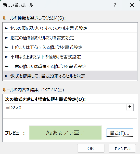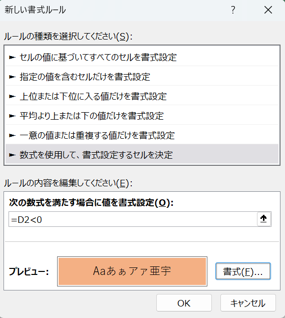 「数式を使用して、書式設定するセルを決定」を選び、以下の数式を入力します。