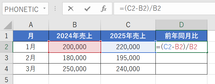 この数式は基本的な増減率と同じですが、比較する対象が前年同月のデータになっている点がポイントです。