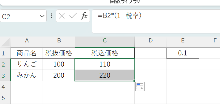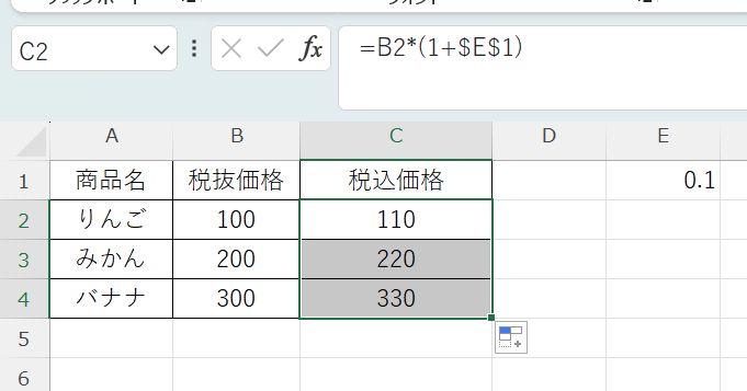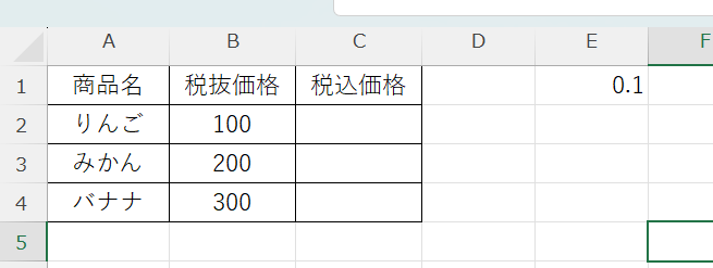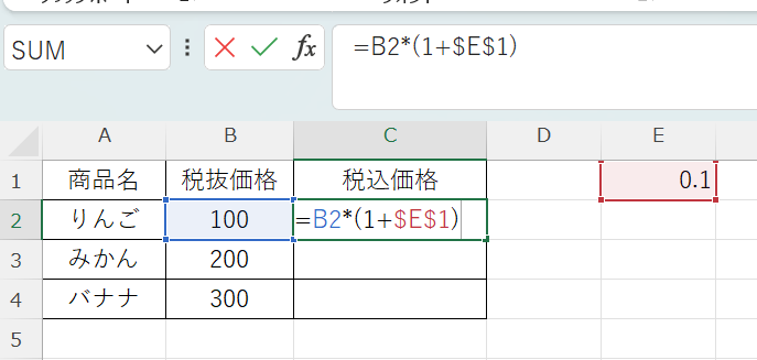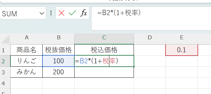 さらに、セルE1に消費税率「0.1」が入力されているとします。C2に次の数式を入力します。