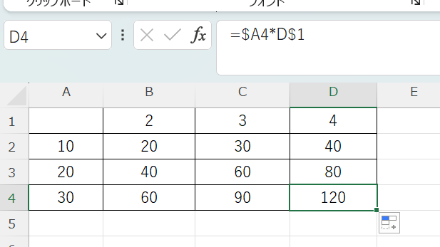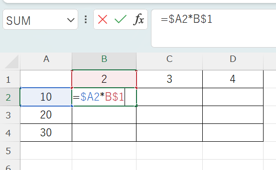 B$1 は「1行目を固定、列は固定しない」という意味で、数式を下にコピーしても1行目の参照が変わりません。この2つを組み合わせることで、B2の数式をC2・D2・B3・C3…と縦横にコピーしても正しく掛け算表が完成します。