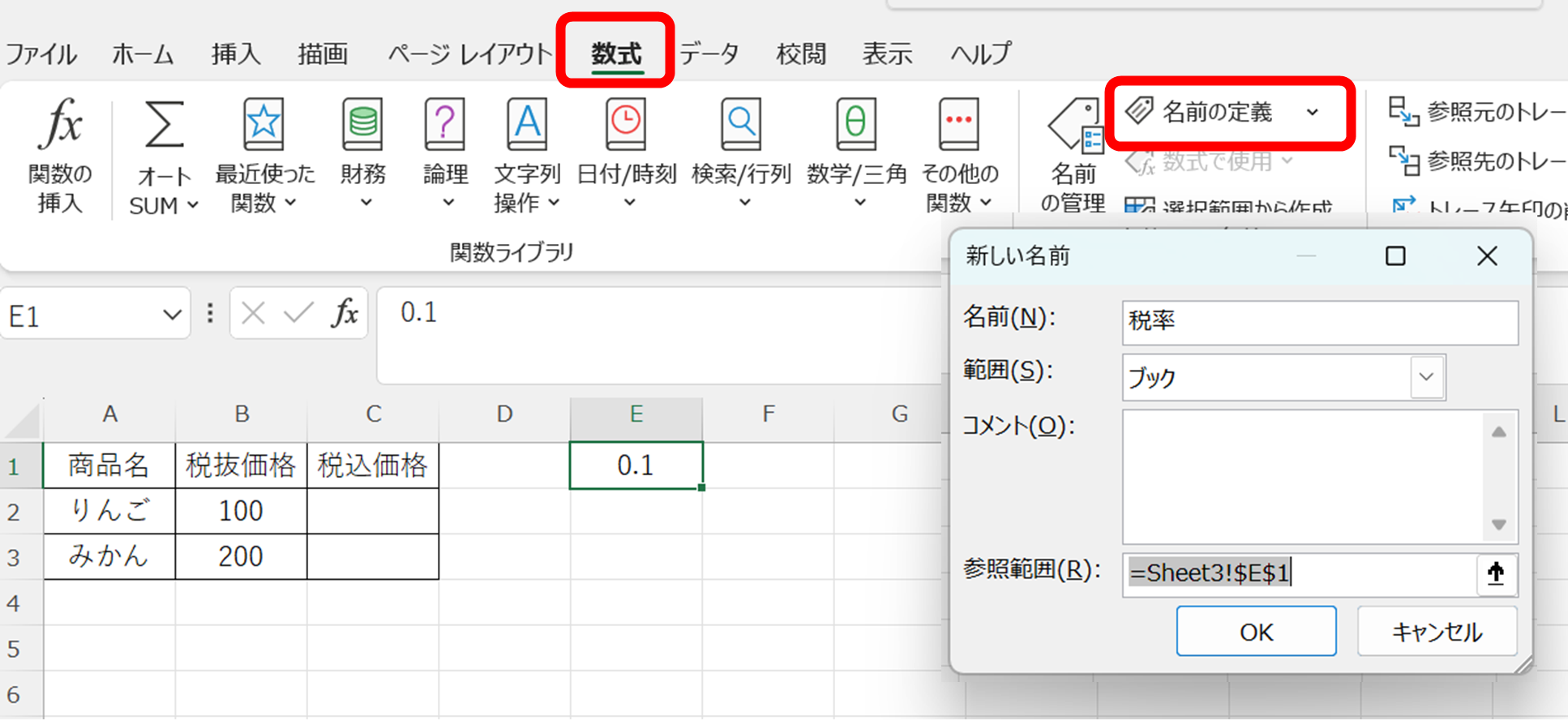 $を使った絶対参照・複合参照のほかに、セルやセル範囲に「名前」を付けて参照する方法もあります。名前を定義したセルは、数式内でその名前を使えるため、固定参照として扱われます。