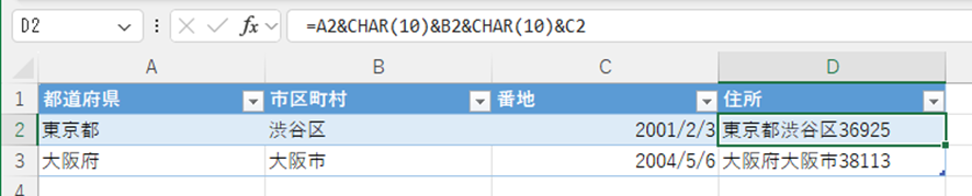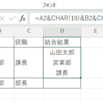 改行を入れた結合方法D2セルに以下の数式を入力しましょう。