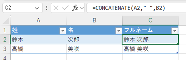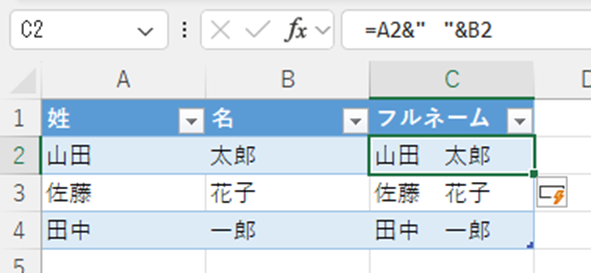 この数式を入力すると、「山田太郎」のように姓と名が1つの文字列として結合されます。