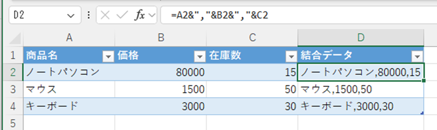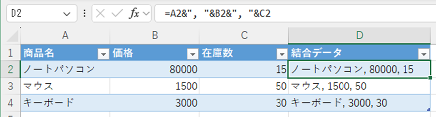 この数式により、「ノートパソコン,80000,15」のようにカンマ区切りでデータが結合されます。カンマの後にスペースを入れたい場合は、”, “(カンマ+スペース)とすると見やすくなりますね。
