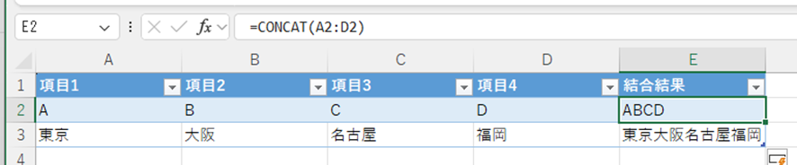 この数式を使用すると、A2からD2までのセルの内容がすべて結合され、「ABCD」と表示されます。
