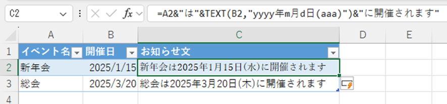この数式を使うことで、「新年会は2025年1月15日に開催されます」といった文章を、セルの値をもとに自動で作成できます。