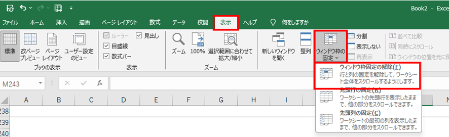 ウィンドウ枠の固定を解除するには、リボンの「表示」タブをクリックします。