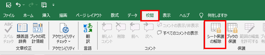 「保護」グループ内の「シート保護の解除」ボタンをクリックしましょう。