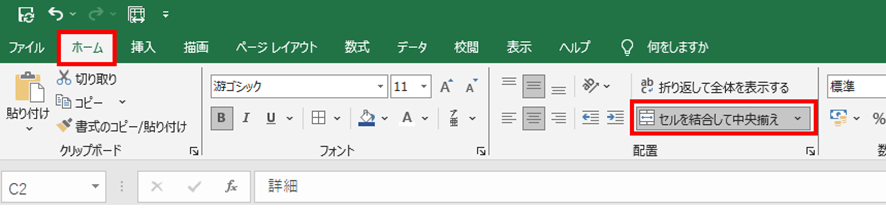 「ホーム」タブの「配置」グループにある「セルを結合して中央揃え」ボタンをクリックしましょう。