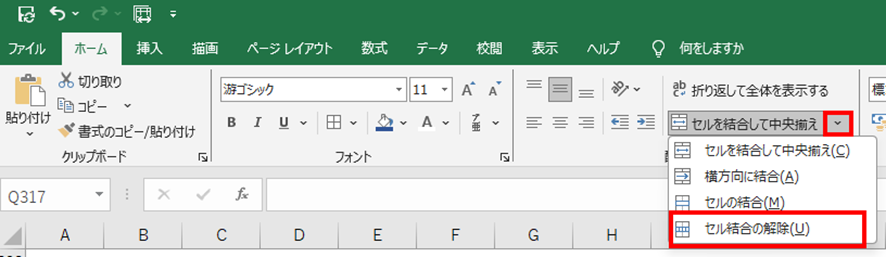 または、ボタンの右側にある下向き矢印をクリックして「セル結合の解除」を選択することもできます。