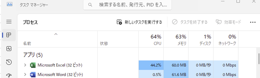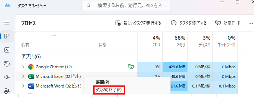 「プロセス」タブでMicrosoft Excelを探して選択し、「タスクの終了」ボタンをクリックしましょう。
