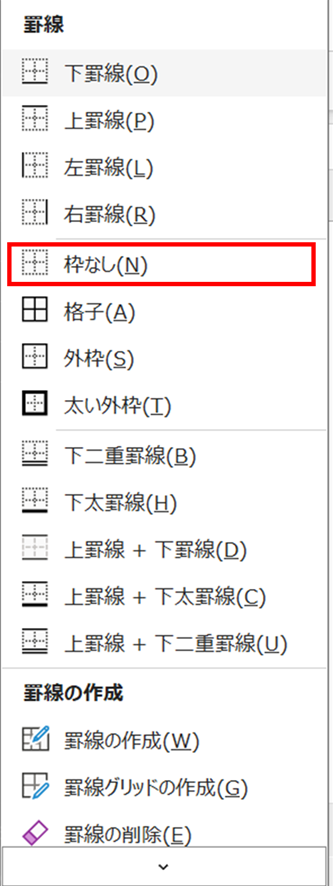 表示されるメニューから「枠なし」を選択すれば、選択範囲の罫線が全て削除されます。