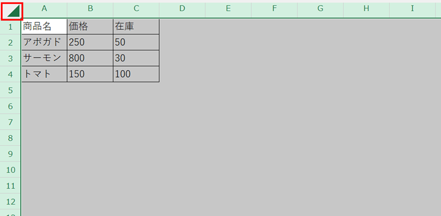 シートの左上隅にある全選択ボタン(行番号と列番号の交差部分)をクリックするか、Ctrl + A キーを押してください。