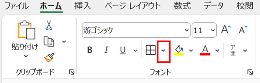 または、「ホーム」タブをクリックして、「フォント」グループにある「罫線」ボタンの横の下矢印をクリックする方法もあります。