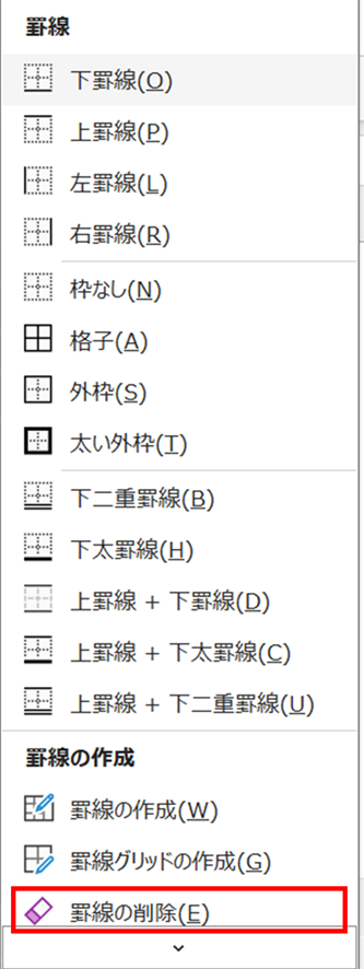 外枠だけ残して内側の罫線を削除したい場合など、特定のパターンで削除したい場合は、罫線メニューから適切なオプションを選択します。