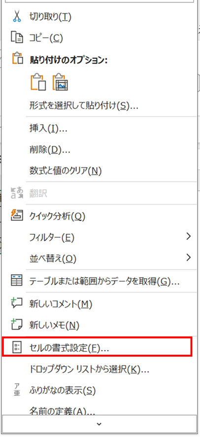 選択範囲を右クリックして、メニューから「セルの書式設定」を選択してください。または、Ctrl + 1 キーを押すことでも開けます。