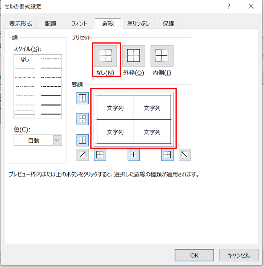 または、上側の「プリセット」ボタンから「なし」を選択すれば、全ての罫線を削除できるわけです。