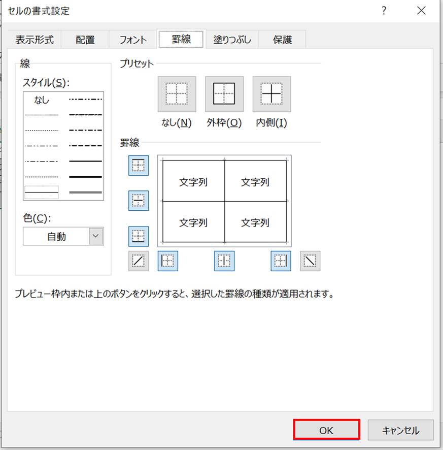 ダイアログの中央にあるプレビュー画面で、削除したい罫線の位置をクリックしてください。