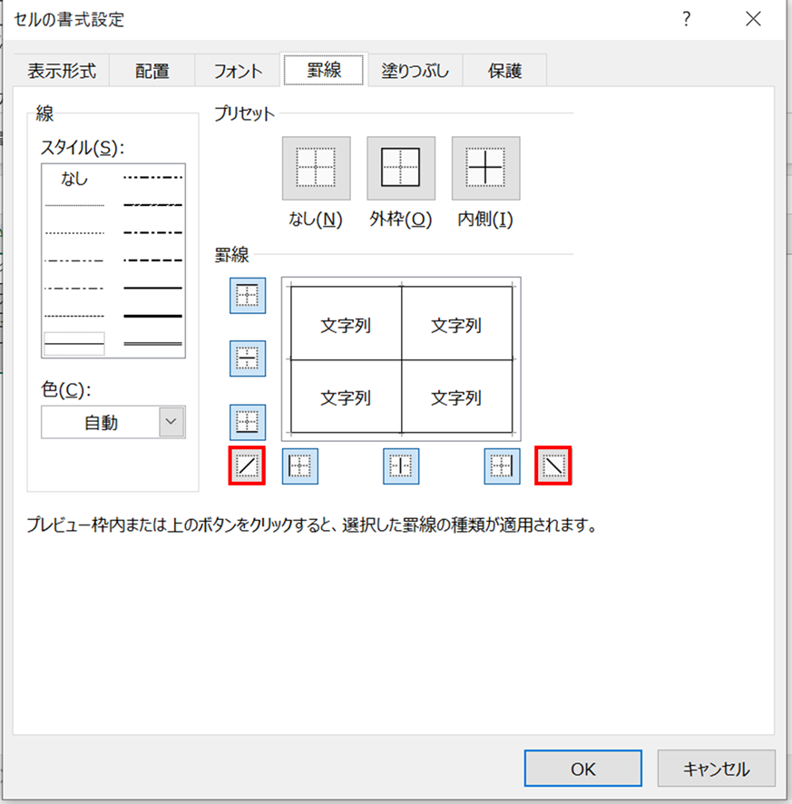 プレビュー画面では、上下左右や斜めの各辺をクリックすることで、個別に罫線を追加・削除できます。