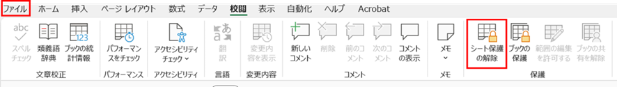 「校閲」タブをクリックして、「シート保護の解除」ボタンが表示されているか確認してください。